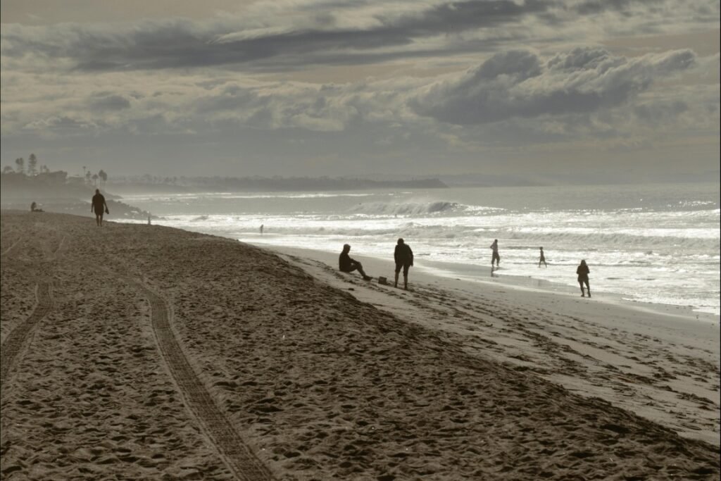 The amenities are equally strong. A large grassy area and playground at Kellogg Park sit right at the beach’s southern end. A wide cement boardwalk separates the park from the sand, making it easy to set up for a day without the usual half-mile schlep through soft sand. Restrooms and showers are on-site. A few blocks away on Avenida de la Playa — a street that’s been closed to traffic and turned into a pedestrian dining zone — you’ll find solid restaurants and a coffee shop where you can grab lunch without losing your spot on the sand.